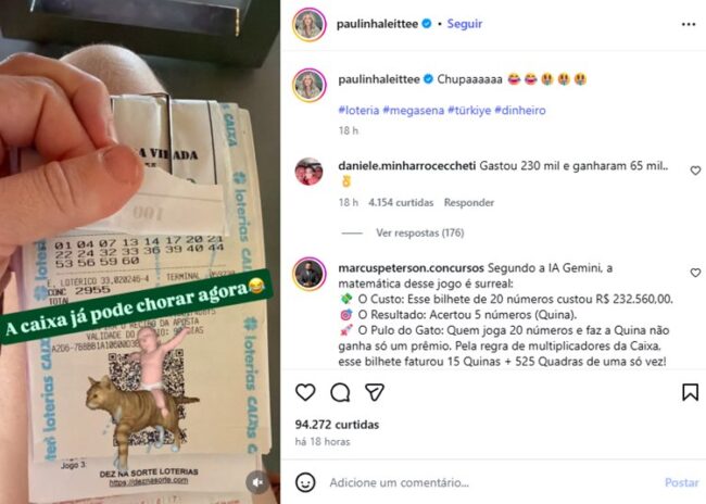 No bilhete exibido no post da influenciadora, é possível ver que ela apostou em quase todos os números sorteados, exceto por um: o número 09. Os números sorteados do concurso foram: 09 – 13 – 21 – 32 – 33 – 59. Nos Stories do Instagram, Paulinha ainda provocou seguidores com mais uma aposta ganhadora da quina.