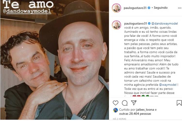 “@dandowaymodel você é um amigo, irmão, querido, iluminado e eu só tenho coisas lindas pra falar de você! A forma como você enxerga a vida, o respeito que você tem pelas pessoas, pelos seus artistas, a paixão que você tem pelo seu trabalho, a forma como você cuida da sua familia…é tudo muito inspirador!”, comenta Paulo Gustavo.