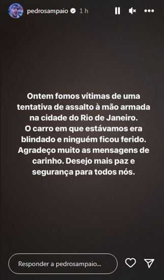 O artista tranquilizou os seguidores e agradeceu as mensagens que vem recebendo. “O carro em que estávamos era blindado e ninguém saiu ferido. Agradeço muito as mensagens de carinho. Desejo mais paz e segurança para todos nós”, completou.