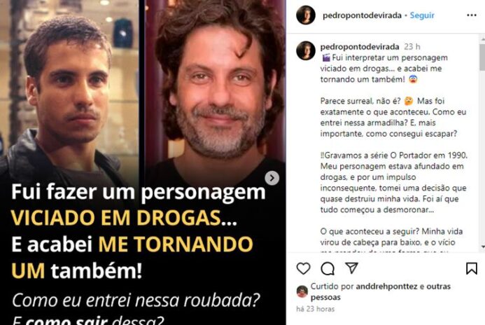 Através do seu Instagram oficial, Pedro Vasconcelos contou: “Fui interpretar um personagem viciado em drogas… e acabei me tornando um também! Parece surreal, não é? Mas foi exatamente o que aconteceu. Como eu entrei nessa armadilha? E, mais importante, como consegui escapar?”, iniciou ele, que além de ator é ex-diretor.