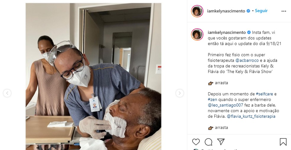 Na postagem do Instagram, Kely apresenta um vídeo com o processo de fisioterapia de Pelé e diz: “Hoje foram dois passos para a frente”.
