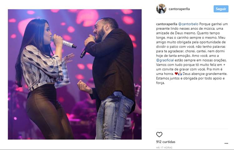 Na sexta-feira (30), Perlla fez um show de reestreia com o cantor Belo, na Quadra da Mocidade, em Padre Miguel, na Zona Oeste do Rio de Janeiro, cantando o dueto “Depois do Amor”, que ela gravou com o pagodeiro.