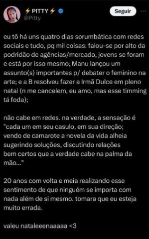 A roqueira provoca: ”Eu tô há uns quatro dias sorumbática com redes sociais e tudo, porque mil coisas: falou-se por alto da podridão de agências/mercado, jovens se foram e está por isso mesmo; Manu lançou um assunto(s) importantes para debater o feminino na arte; e a B resolveu fazer a Irmã Dulce em pleno Natal (não me cancelem, eu amo, mas esse timming tá fod*)”, disse.
