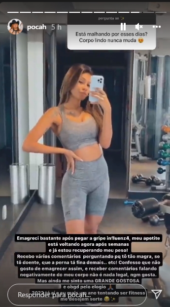 Fato que inclusive foi notado por internautas que seguiram questionado a ex BBB sobre a nova silhueta. Através dos Instagram na ferramenta dos Stories, ela postou um clique onde fala o motivo de seu emagrecimento, e de que contraiu uma gripe muito forte.