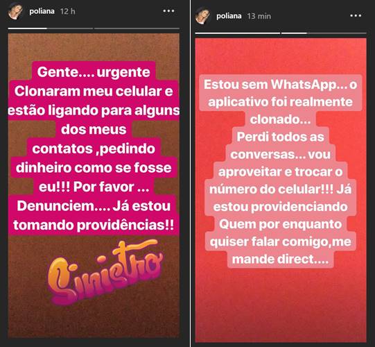 Na publicação, Poliana comentou que estão usando seu número para pedir dinheiro. Ela também revelou que já está tomando as devidas providências. “Gente, urgente”, iniciou.