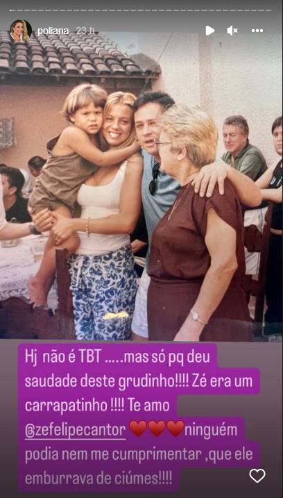 Na primeira foto postado no Instagram Stories, Poliana expõe o primeiro registro que resolveu tirar do álbum de família. Na imagem ela aparece com Zé Felipe no colo e o marido Leonardo do lado. Na legenda ela escreveu o seguinte: ”Hj não é TBT….mas só pq deu saudade deste grudinho!!!! Zé era um carrapatinho!!! Te amo @zefelipecantor. Ninguém podia nem me cumprimentar, que ele emburrava de ciúmes”, disse a esposa de Leonardo.