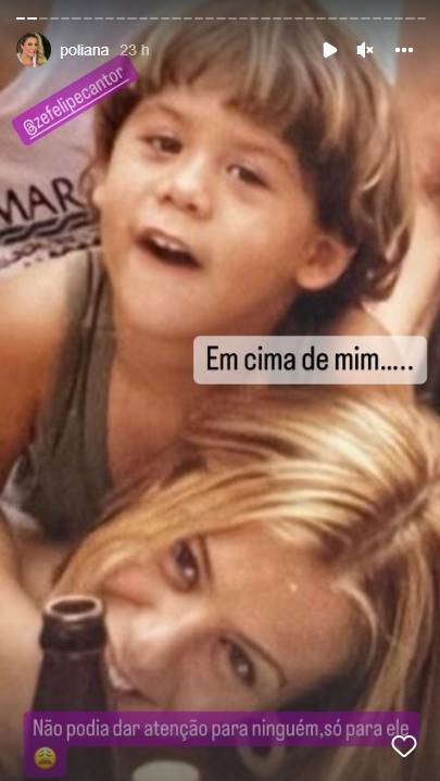 Na próxima foto Poliana faz uma espécie de brincadeira e posta a mesma imagem novamente. Agora ela dá adjetivos aos envolvidos na foto. Na sua prórpia fotografia ela escreve: ”Olhar de cansaço”. Na foto de Zé Felipe ela resolveu escrever: ”Emburrado”. E na imagem do cantor Leonardo ela coloca: ”Descansado e gato”, diz a jornalista. O próximo registro traz uma foto inédita de Poliana e Zé Felipe, na ocasião o pequeno está em cima das costas da mãe enquanto ela sorri para o clique. A loira escreveu: ” @zefelipecantor… Em cima de mim…Não podia dar atenção para ninguém, só para ele”, diz a mãe do cantor da música ‘Bandido’.