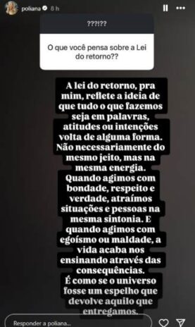 “A lei do retorno, para mim, reflete a ideia de que tudo o que fazemos — seja em palavras, atitudes ou intenções — volta de alguma forma. Não necessariamente da mesma maneira, mas na mesma energia”, iniciou ela, diretamente dos stories do Instagram.
