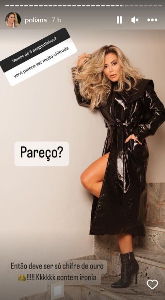 Tudo começou quando uma internauta afirmou que Poliana Rocha parece ser muito ‘chifruda’. Irônica, a influenciadora rebateu o comentário e afirmou: “então deve ser só chifre de ouro”. Logo em seguida, a esposa de Leonardo enfatizou que a frase contém muita ironia.