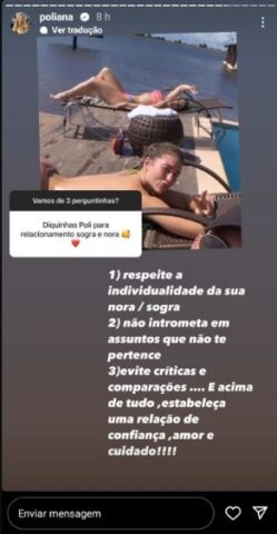 Por meio dos Stories no Instagram, Poliana Rocha compartilhou a dúvida de uma seguidora: “Diquinhas Poli para relacionamento sogra e nora“, pediu a fã. “1) respeite a individualidade da sua nora/sogra. 2) não intrometa em assuntos que não te pertence. 3) evite criticas e comparações …. E acima de tudo, estabeleça uma relação de confiança, amor e cuidado!!!!“, respondeu ela, compartilhando uma foto de Virginia e ela em uma espreguiçadeira na fazenda Talismã.