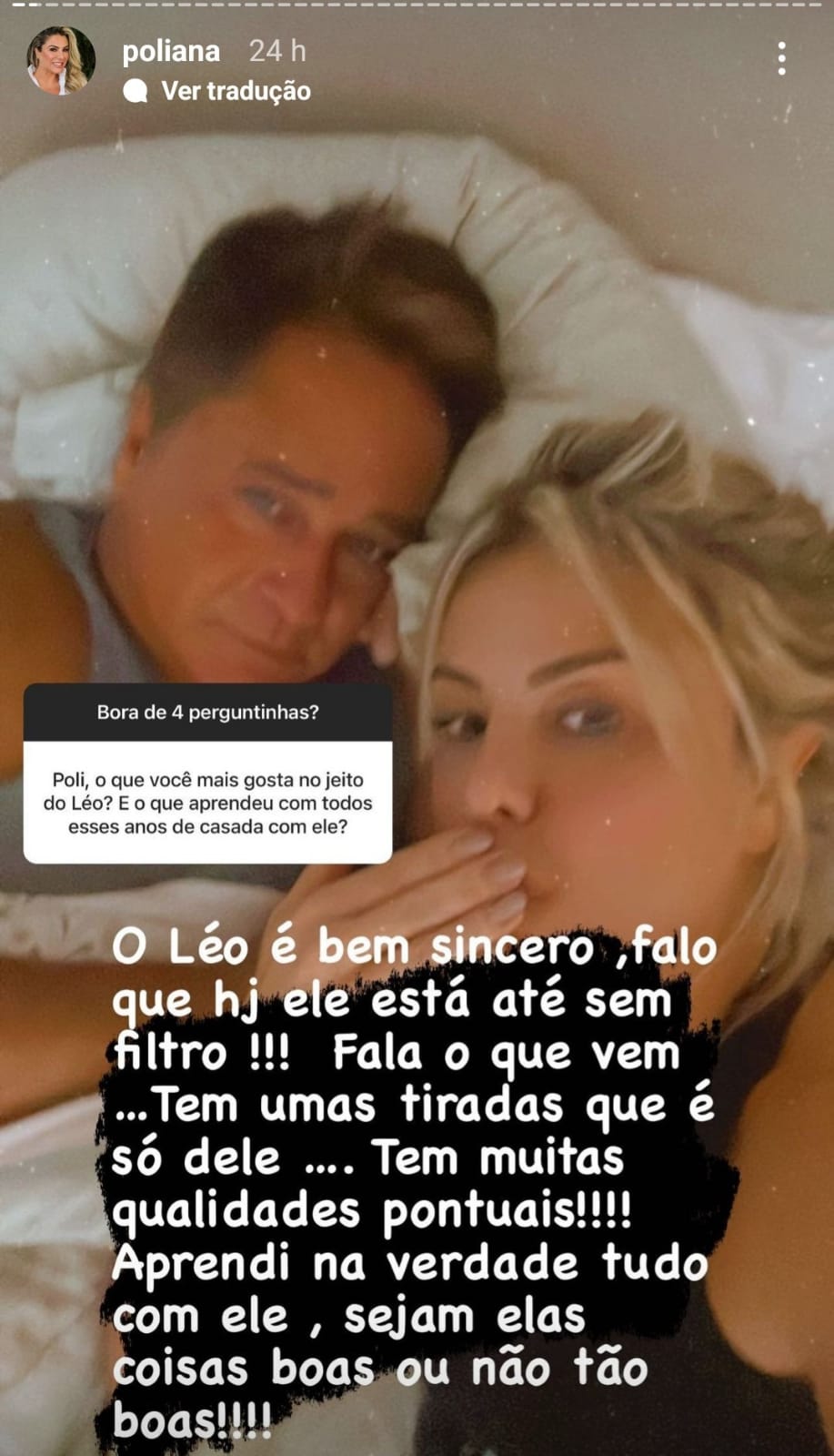 Dessa forma, por meio dos stories no Instagram, Poliana Rocha compartilhou um questionamento de uma seguidora, que lhe perguntou: “Poli, o que você mais gosta no jeito do Léo? E o que aprendeu com todos esses anos casada com ele?”, questionou a fã.
