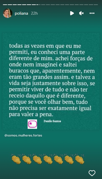 Dessa forma, por meio de uma publicação no Instagram, Poliana Rocha compartilhou: “Todas as vezes em que eu me permitir, eu conheci uma parte diferente de mim. Achei forças de onde nem imaginei e saltei buracos que, aparentemente, nem eram tão grandes assim. E talvez a vida seja justamente sobre isso, se permitir viver de tudo e não ter receio daquilo que é diferente, porque se você olhar bem, tudo não precisa ser exatamente igual para valer a pena”, postou ela, em seus stories.