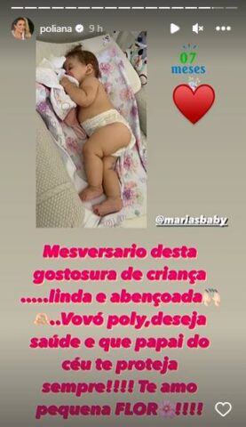 Dessa forma, por meio dos stories no Instagram, Poliana Rocha compartilhou uma foto de Maria Flor dormindo no berço e, na legenda, escreveu: “Mesversário desta gostosura de criança…. linda e abençoada. Vovó Poly, deseja saúde e que papai do céu te proteja sempre!!! Te amo pequena Flor!!!“, declarou a esposa de Leonardo.