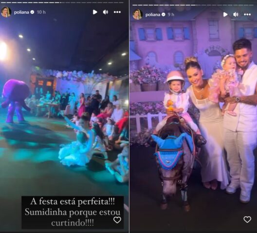 Já em outro vídeo de seus Stories, a influencer exibe uma cena com a nora, o filho e as netas. Maria Alice está sentada em um pônei e Maria Flor nos braços do pai. Neste determinado momento, Poliana diz em tom de emoção: ”Gente, olha aqui que coisa mais linda”, aponta a mulher. Em mais um registro, a profissional de comunicação explica que a neta aproveitou bastante a celebração: ”Fiquei muito feliz porque Maria Alice super curtiu a festa, aproveitou, brincou, comeu e foi tudo lindo”, declarou.