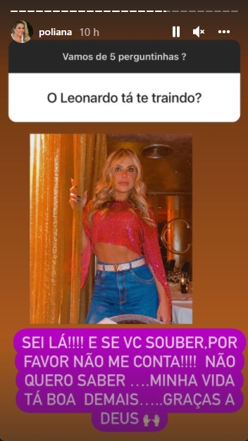 Dessa forma, Poliana Rocha resolveu responder alguns internautas na caixinha mais temida do Instagram, e ao ser questionada sobre uma traição de Leonardo ela disparou: “Não me conta!”. A jornalista, que, recentemente, relatou crise de ansiedade, acabou sendo perguntada se estava sendo traída e deu uma resposta bem sincera.