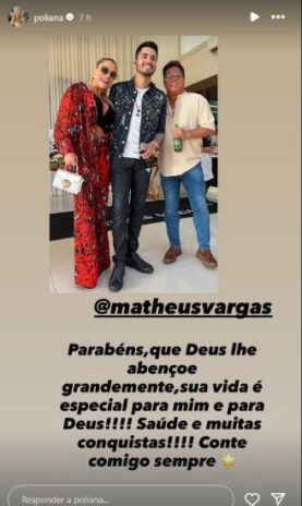 A madrasta de Matheus revelou que, neste dia, deseja que Deus o abençoe grandemente e afirmou que a vida dele é muito especial para ela. Poliana também desejou saúde e conquistas ao enteado, frisando que ele sempre poderá contar com ela.