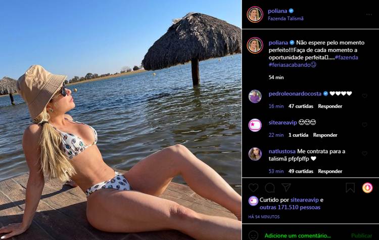Na imagem, ela aparece de biquíni, mostrando a boa forma e filosofa: “Não espere pelo momento perfeito!!!Faça de cada momento a oportunidade perfeita…..#fazenda #feriasacabando”, escreveu.