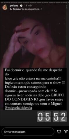 Dessa forma, por meio dos stories no Instagram, às 05h52 desta madrugada, Poliana Rocha comunicou: “Fui dormir e quando fui me despedir do Leleo, ele não estava na sua casinha!!! Fugiu ontem quando saímos para o show [Leonardo]!!! Dai não conseguindo dormir…. preocupada com ele!!!! Se alguém tiver notícias dele, no GRUPO DO CONDOMINIO, por favor entre em contato comigo ou com o Miguel @miguelalcidesda“, comunicou ela.