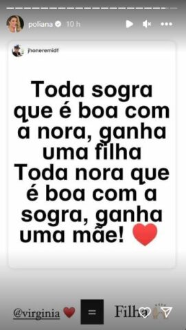 Dessa forma, em meio a burburinho de que ambas não se dão bem, Poliana Rocha voltou a declarar que ama Virginia Fonseca como uma filha, frisando nos stories do Instagram: “Toda sogra que é boa com a nora, ganha uma filha. Toda nora que é boa com a sogra, ganha uma mãe“, estava escrito em um banner à qual Poli compartilhou. No entanto, ao encerrar a postagem, ela ainda marcou a influenciadora: “@Virginia = filha“, disse.
