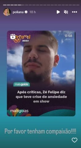 Dessa forma, por meio dos stories do Instagram, Poliana Rocha compartilhou o vídeo de Zé Felipe explicando o motivo de sua performance não ter sido igual as demais. No entanto, na legenda da postagem, a esposa de Leonardo desabafou e escreveu: “Por favor tenham compaixão“, pediu ela, indignada com as criticas que o seu filho recebeu.