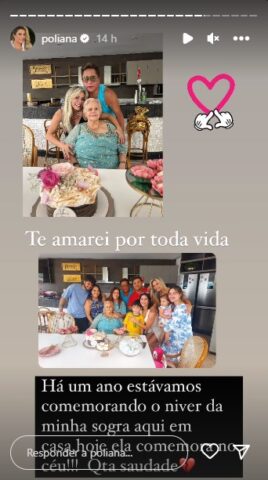 Dessa forma, por meio dos stories no Instagram, Poliana Rocha comoveu ao lembrar que ontem, 19, seria o aniversário de sua querida e eterna sogra, destacando a saudade que estava sentindo dela, ainda, compartilhando um clique do último aniversário dela em família. “Te amarei por toda vida“, legendou a esposa de Leonardo.