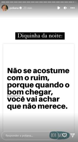 Em sua conta oficial do Instagram Stories, a mãe de Zé Felipe repostou mais uma ‘diquinha da noite’ e mandou uma suposta indireta. No texto que a profissional de comunicação compartilhou é dito o seguinte: ”Não se acostume com o ruim, porque quando o bom chegar, você vai achar que não merece”, expôs a sogra de Virgínia. Confira abaixo!