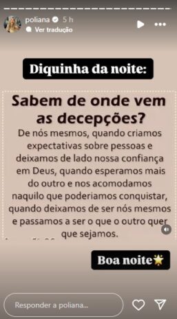 Em seguida, o texto apontava: “Quando esperamos mais do outro e nos acomodamos naquilo que poderiamos conquistar, quando deixamos de ser nos mesmos e passamos a ser o que o outro quer que sejamos“, dizia a mensagem. “Boa noite“, encerrou Poliana.