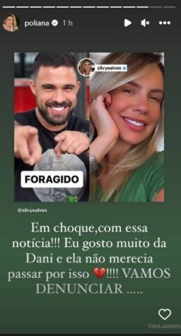 No entanto, na legenda da publicação divulgada por Poliana, Silvye Alves detalhou o caso: “COMPARTILHEM! Este homem se chama Gabriel e quase decepou o braço da ex-namorada com um facão… Dani está internada… Peço ajuda à Polícia Militar e Polícia Civil de todo país, além dos agentes presentes nos aeroportos e rodoviárias para tentar encontrá-lo… @dani_cgonsalves“, escreveu ela, em seu perfil oficial no Instagram.