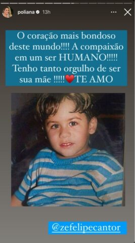 ”O coração mais bondoso deste mundo! A compaixão em um ser humano! Tenho tanto orgulho de ser sua mãe! Te amo”, escreveu Poliana. Zé é o único filho da jornalista com Leonardo, que possui mais outros 4, frutos de outros relacionamentos.