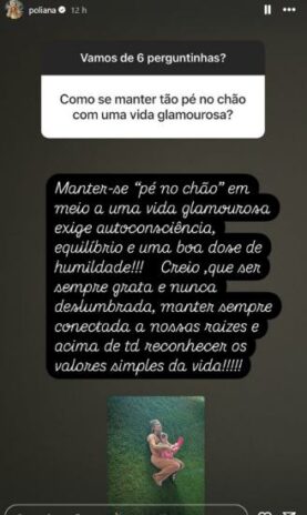 “Sim, com certeza. Estou em um momento em que me sinto confiante, realizada e aproveitando as oportunidades que a vida está me dando”, esclareceu Poliana, na mesma rede social.
