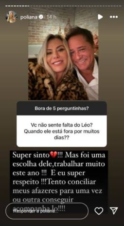 Por meio dos stories no Instagram, Poliana Rocha compartilhou uma dúvida de um de seus milhares de fãs: “Você não sente falta do Léo? Quando ele está fora por muitos dias?“, quis saber a pessoa que não teve sua identidade revelada. Logo, a mãe de Zé Felipe respondeu: “Super sinto!!!“, afirmou.