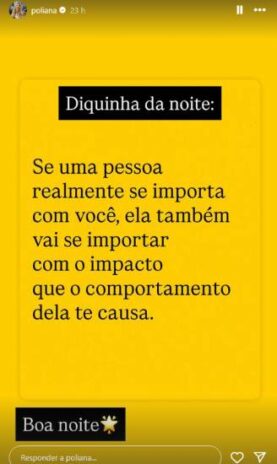 A postagem de ‘diquinha da noite’ de Poliana Rocha que fez o público entender como uma susposta indireta, negada por ela acima, a um amigo de Ana Castela foi a seguinte: “Se uma pessoa realmente se importa com você, ela também vai se importar com o impacto que o comportamento dela te causa”, compartilhou a influenciadora.