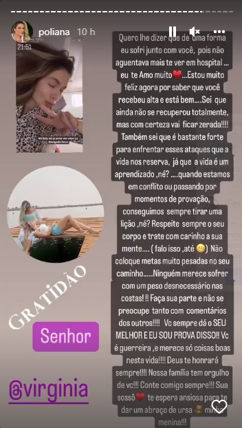 “Quero lhe dizer que de uma forma eu sofri junto com você, pois não aguentava mais te ver em hospital… Eu te amo muito. Estou muito feliz agora por saber que você recebeu alta e está bem… Sei que ainda não se recuperou totalmente, mas com certeza vai ficar zerada! Também sei que é bastante forte para enfrentar esses ataques que a vida nos reserva, já que a vida é um aprendizado, né? Quando estamos conflito ou passando por momentos de provação, conseguimos sempre tirar uma lição, né?”, iniciou Poliana Rocha.