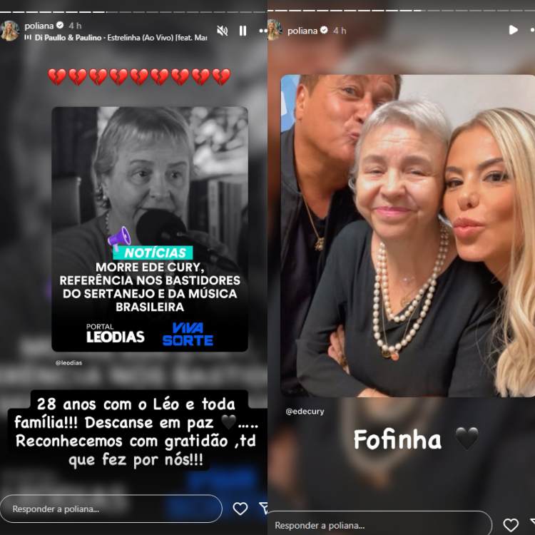 “28 anos com o Léo e toda a família. Descanse em paz”, iniciou Poliana. Em seguida, a esposa do cantor reconheceu, em nome de toda a família, o empenho de Ede Cury: “Reconhecemos com gratidão tudo que fez por nós”, expressou a mãe de Zé Felipe.