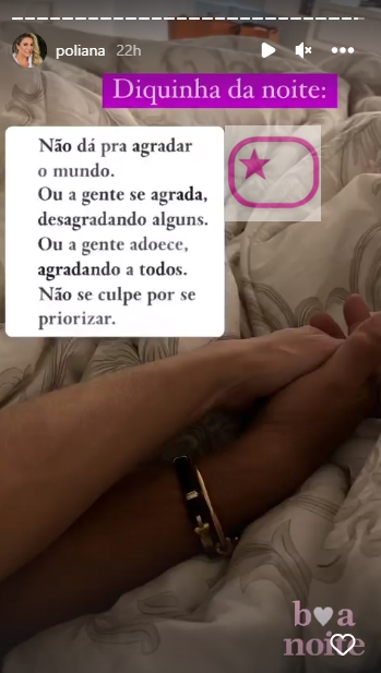 Dessa forma, por meio de seus stories, Poliana Rocha compartilhou sua ‘diquinha da noite’ em forma de desabafo: “Não dá para agradar o mundo. Ou a gente se agrada, desagradando alguns. Ou a gente adoece agradando a todos. Não se culpe por se priorizar”, disparou a mãe de Zé Felipe.