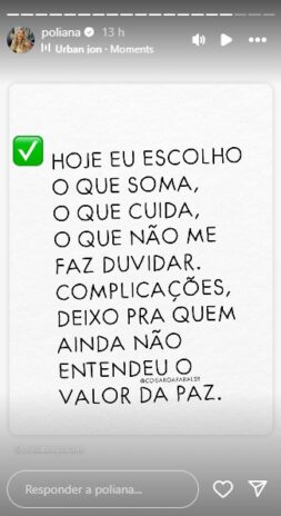 “Hoje eu escolho o que soma, o que cuida, o que não me faz duvidar. Complicações, deixo para quem ainda não entendeu o valor da paz“, disparou ela, sem mais e nem menos nos stories do Instagram. No passado, a loira confessou que a maioria dos stories que publica é de algo que acontece no seu dia-a-dia.