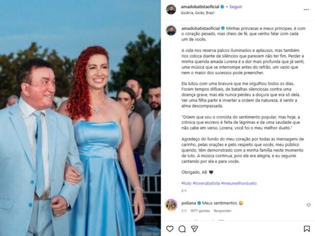 Vale destacar que Poliana Rocha se pronunciou na postagem comovente de Amado Batista sobre a morte da filha: “Minhas princesas e meus príncipes, é com o coração pesado, mas cheio de fé, que venho falar com cada um de vocês. A vida nos reserva palcos iluminados e aplausos, mas também nos coloca diante de silêncios que parecem não ter fim. Perder a minha querida amada Lorena é a dor mais profunda que já senti, uma música que se interrompe antes do refrão, um vazio que nem o maior dos sucessos pode preencher”, iniciou ele.