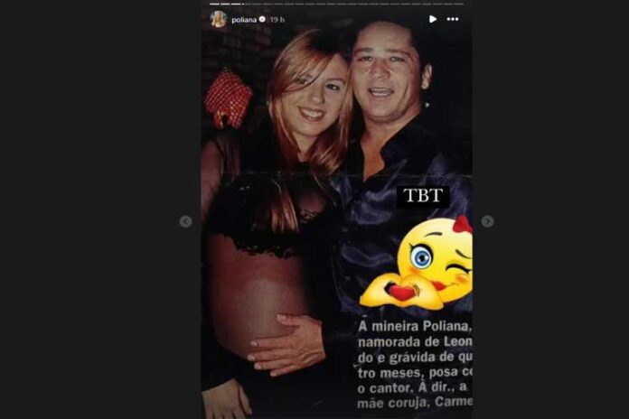 A empresária aparece bem diferente ao lado de Leonardo em uma manchete divulgada por uma revista em 1998, ano de nascimento do herdeiro. A esposa do sertanejo tinha apenas 22 anos na época e usa um look transparente enquanto o cantor segura sua barriga. “TBT”, escreveu Poliana na legenda, mostrando a imagem da manchete.