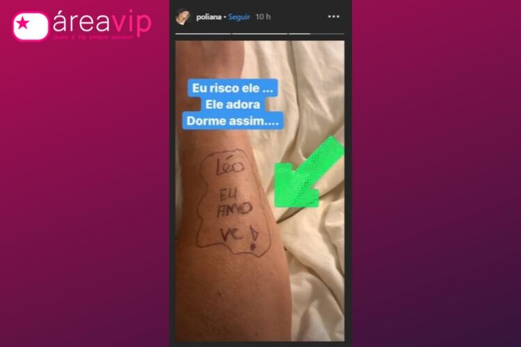 Sem vergonha alguma de demonstrar todo o carinho que sente pelo amado ela contou que costuma deixar recadinhos rabiscados em sua pele, enquanto ele dorme. Desta vez, ela foi simples na declaração, mas muito grande no amor: “Leo, eu amo você“. Na legenda, ela deu mais detalhes: “Eu risco ele, ele adora… dorme assim”, disse ela.