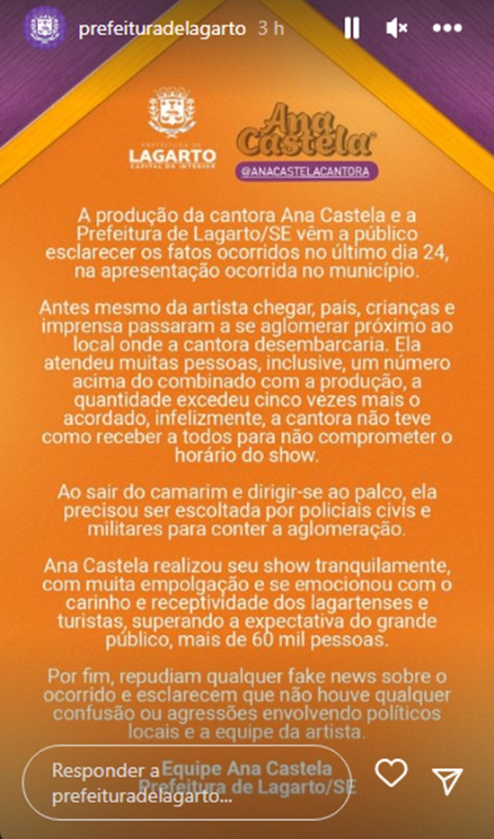Nesta segunda-feira (26), a prefeitura de Lagarto emitiu nota esclarecendo os acontecimentos. “A produção da cantora Ana Castela e a Prefeitura de Lagarto/SE vem a público esclarecer todos os fatos ocorridos no último dia 24, na apresentação ocorrida no município. Antes mesmo da artista chegar, pais, crianças e imprensa passaram a se aglomerar próximo ao local que a cantora desembarcaria”, diz o comunicado publicado nas redes sociais.