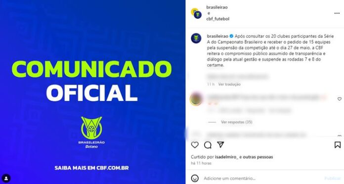 Em nota oficial, a CBF comunicou a decisão acatada por Ednaldo Rodrigues: “Após consultar os 20 clubes participantes da Série A do Campeonato Brasileiro e receber o pedido de 15 equipes pela suspensão da competição até o dia 27 de maio, a CBF reitera o compromisso público assumido de transparência e diálogo pela atual gestão e suspende as rodadas 7 e 8 do certame“, publicaram.