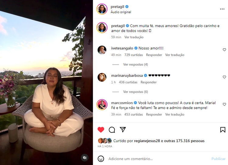 Amigos da cantora logo inundaram os comentários com mensagens de apoio. “Você luta como poucos! A cura é certa, Maria! Fé e força não te faltam! Te amo e admiro desde sempre!”, escreveu Marcos Mion. “Vai vencer Preta! Muita fé!!!”, disse Pedro Scooby. “Te amo ❤“, declarou Bruno Gagliasso. “Nosso amor!!!”, escreveu Ivete Sangalo.