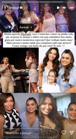 Em sua conta oficial do Instagram Stories, a artista resolveu fazer uma linda homenagem para sua amiga e cantora Karinah. Preta escreveu o seguinte: ”Minha querida @karinah, você é tanta luz e amor na minha vida, que só posso te desejar o dobro em seus caminhos! Que venham muito mais! Mais sucesso e muita saúde pra conquistas tudo que merece! Conta comigo, um lindo dia pra você! Te amo”, enalteceu. Confira a publicação abaixo!