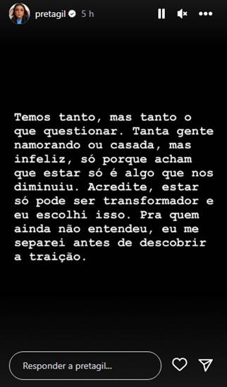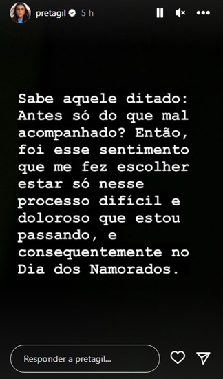 Nos stories de seu perfil no Instagram, ela fez uma reflexão sobre a data romântica.”Sabe aquele ditado: antes só do que mal acompanhado? Então, foi esse sentimento que me fez escolher estar só nesse processo difícil e doloroso que estou passando, e consequentemente no Dia dos Namorados“, começou Preta.