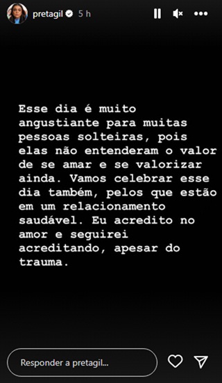 A cantora ainda confessou estar traumatizada, mas sem desistir de acreditar no amor. “Esse dia é muito angustiante para muitas pessoas solteiras, pois elas não entenderam o valor de se amar e se valorizar ainda. Vamos celebrar dia também, pelos que estão em um relacionamento saudável. Eu acredito no amor e seguirei acreditando, apesar do trauma“, finalizou.