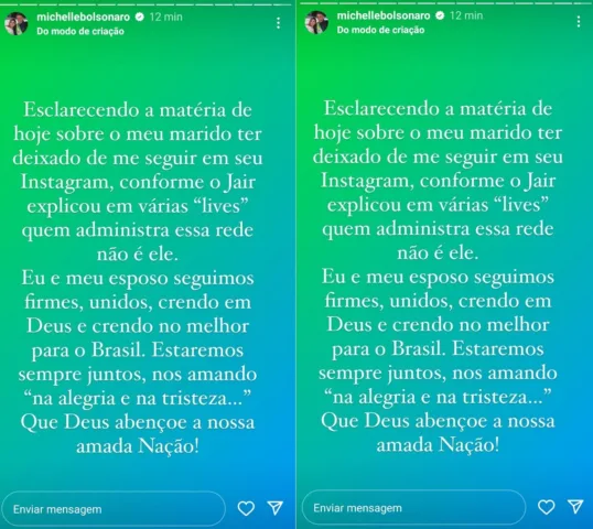 ”Esclarecendo a matéria de hoje sobre o meu marido ter deixado de me seguir em seu Instagram, conforme o Jair explicou em várias ‘lives’ quem administra essa rede não é ele. Eu e meu esposo seguimos firmes, unidos, crendo em Deus e crendo no melhor para o Brasil. Estaremos sempre juntos, nos amando ‘na alegria e na tristeza’. Que Deus abençoe a nossa amada nação”, escreveu a primeira-dama.