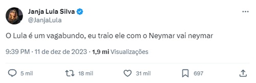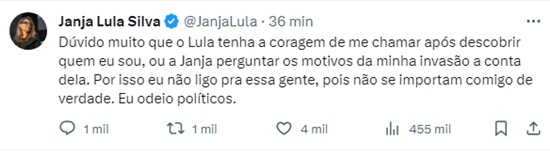O autor do ataque ainda se gabou dizendo duvidar que o presidente ou a primeira-dama farão algo contra ele. “Duvido muito que o Lula tenha a coragem de me chamar após descobrir quem eu sou, ou a Janja perguntar os motivos da minha invasão à conta dela. Por isso eu não ligo pra essa gente, pois não se importam comigo de verdade. Eu odeio políticos”, disse o autor.