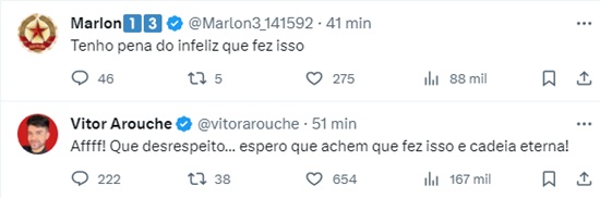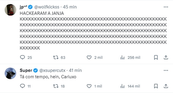 Internautas logo perceberam o que estava acontecendo e comentaram. Teve quem atribuísse às postagens a um dos filhos do ex-presidente Jair Bolsonaro. “Hackearam a Janja kkk”, escreveu um. “Tá com tempo hein Carluxo”, disparou outro. “Tenho pena do infeliz que fez isso”, escreveu um terceiro. “Aff, espero que achem quem fez isso e cadeia eterna”, disse mais um.