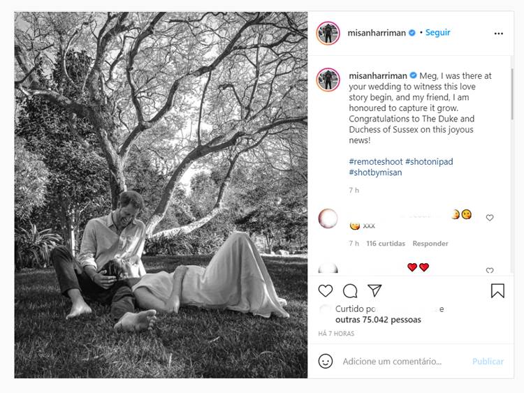 Confira a foto que o casal divulgou mostrando a barriga da duquesa já saliente. A imagem foi tirada pelo fotógrafo Misan Harriman e publicada no Instagram.