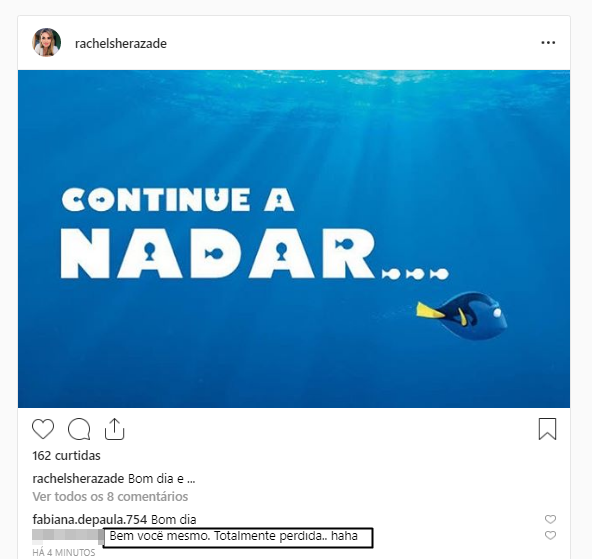 Nos últimos dias, a famosa vem postando uma série de vídeos em seu Instagram e mensagens, supostamente mandando indiretas para políticos e a atual situação política no país. Na manhã desta quarta-feira, ela postou uma foto, de um filme de animação, muito conhecido, em que uma das personagens aparece, com seu famoso bordão: “Continua a nadar.”, e que, tem características de um ser perdido, confuso e engraçado.